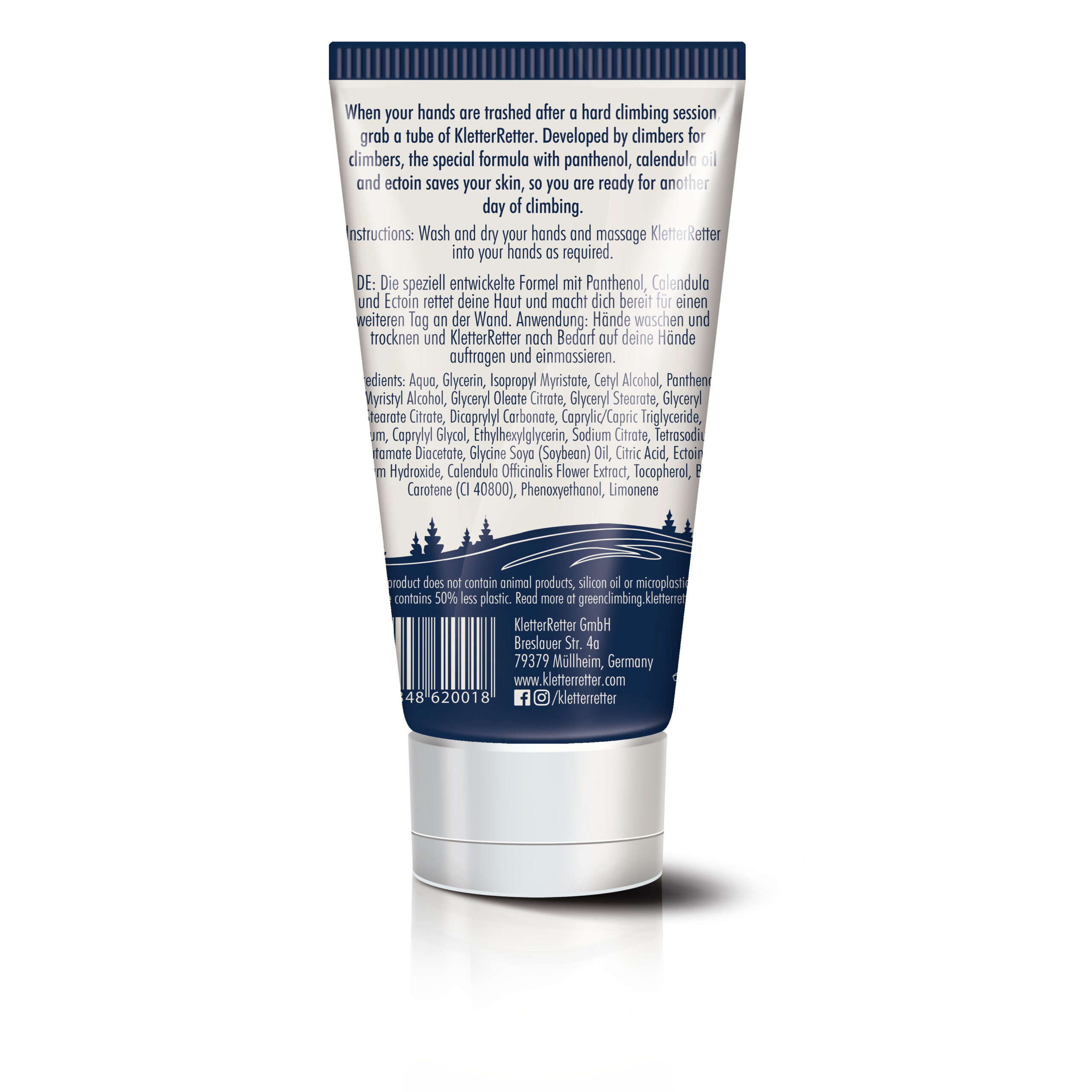 KletterRetter Handcreme ist eine schnelle einziehende, nicht fettende Handcreme zur Pflege deiner Hände nach dem Klettern oder Bouldern. Die von Experten entwickelte und von Klettern getestete Formel unterstützt deine Haut bei der Regenerierung und macht dich bereit für einen weiteren Tag an der Wand.
