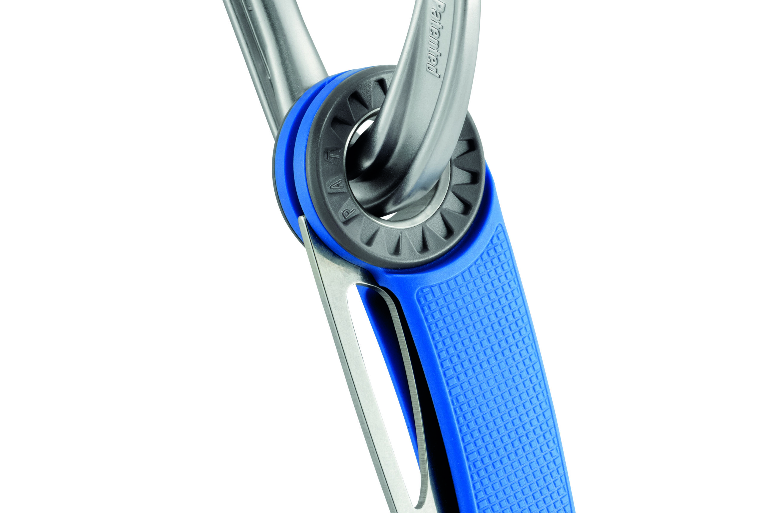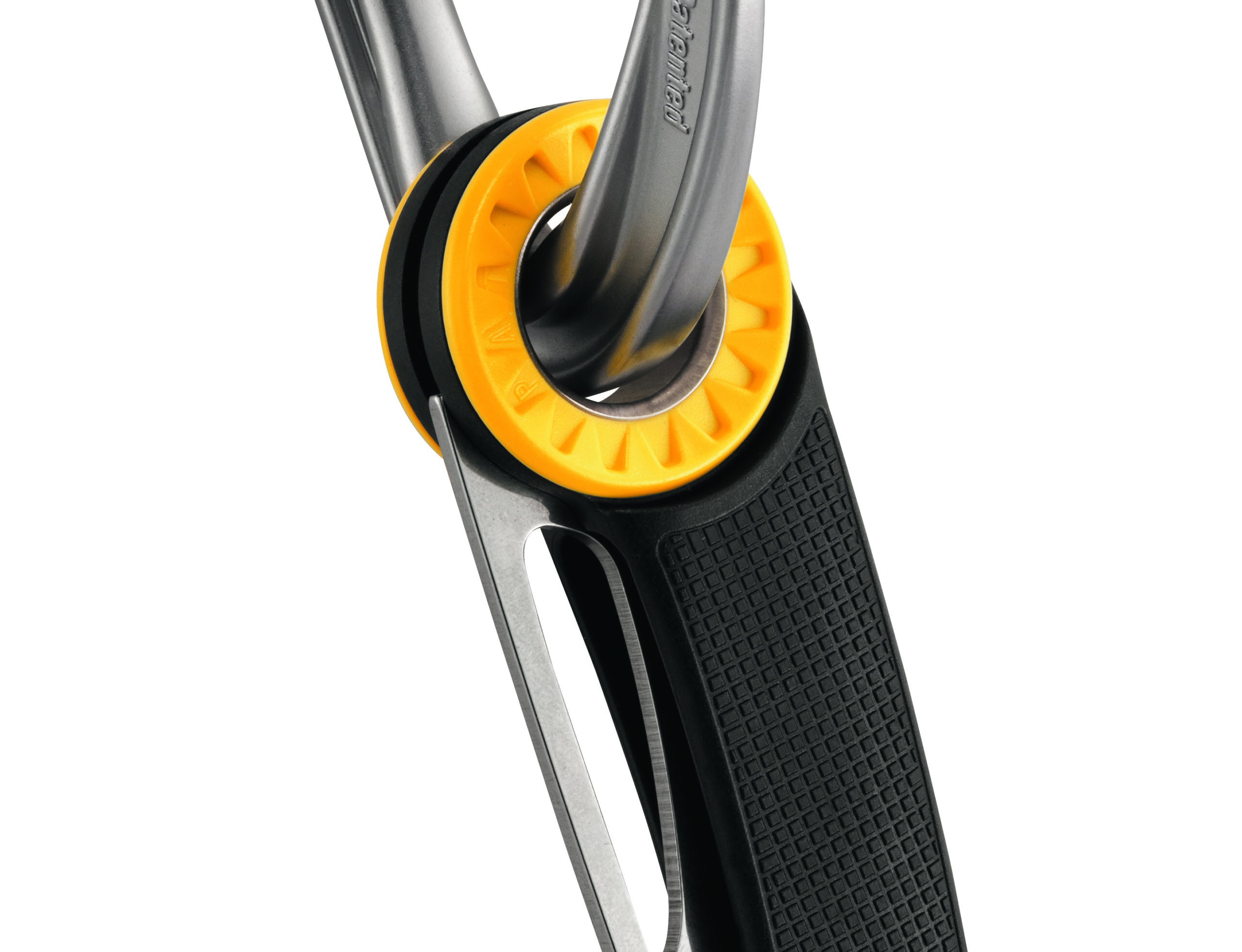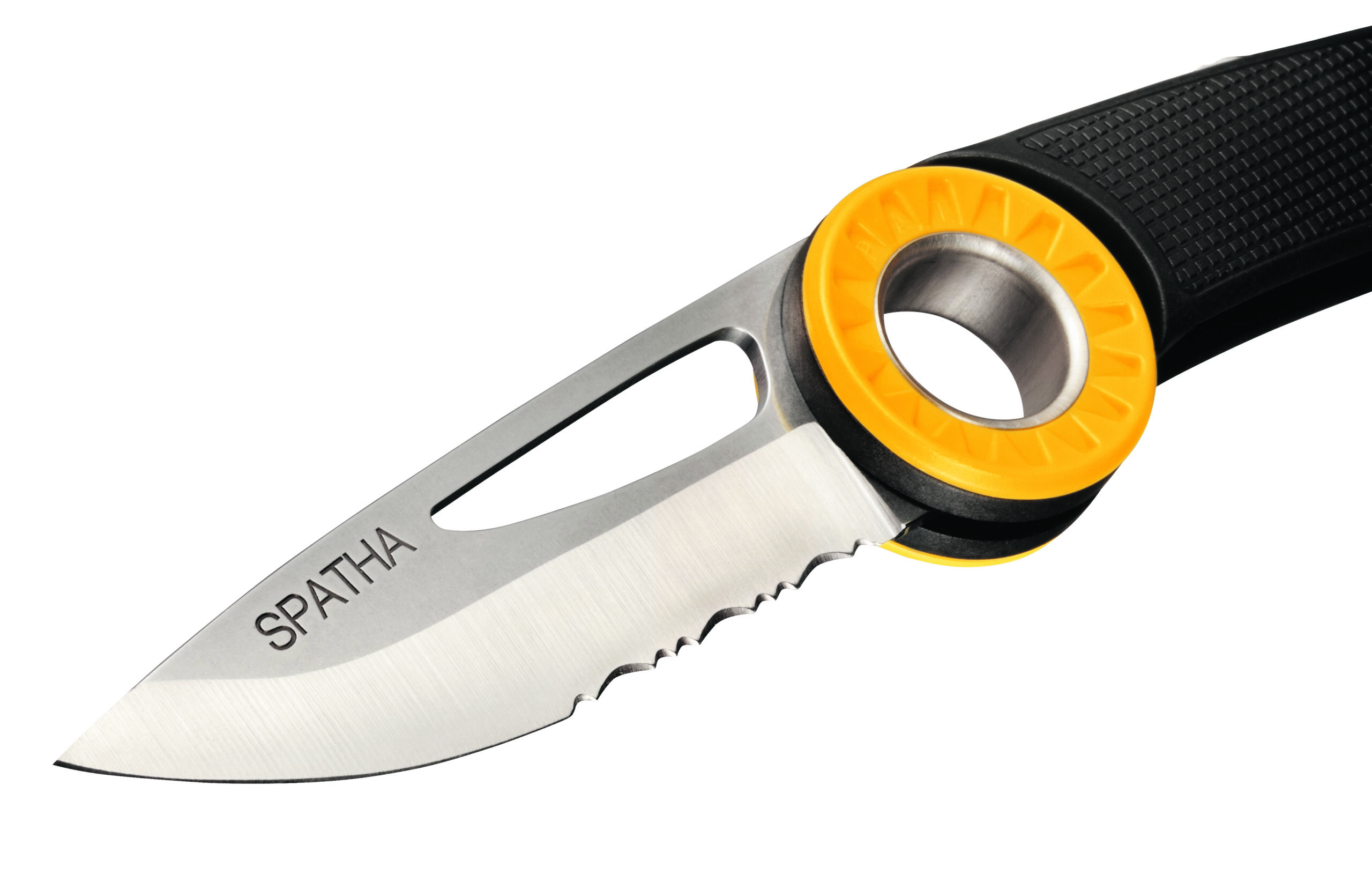 Das SPATHA-Messer zum Einhängen am Karabiner begleitet den Kletterer bei jeder Tour. Das Profil der Klinge eignet sich zum Schneiden von Seilen und Reepschnüren. Das Messer verfügt über eine Öse, um es mit einem Karabiner am Gurt zu befestigen. Dank seines geriffelten Rädchens lässt es sich auch mit Handschuhen öffnen. Außerdem verfügt es über eine Arretierung, um die Klinge in der geöffneten Position zu blockieren.